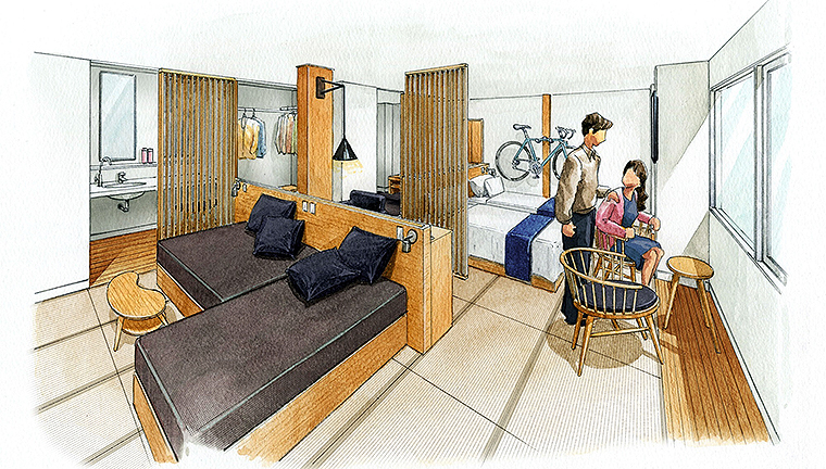 三陸海岸に面した和室2部屋分の広さをひとつにしたプレミアムな和洋室は、サイクリングのあと、大切なロードバイクをフロントからそのまま客室まで持ち込める部屋。寝心地の主役であるマットレスは多くの一流ホテルでも採用されている「日本ベッド製シルキーポケットマットレス」を使用。デイベッドやカウチソファーで波の音を聞きながら、最上級のくつろぎを楽しめる。