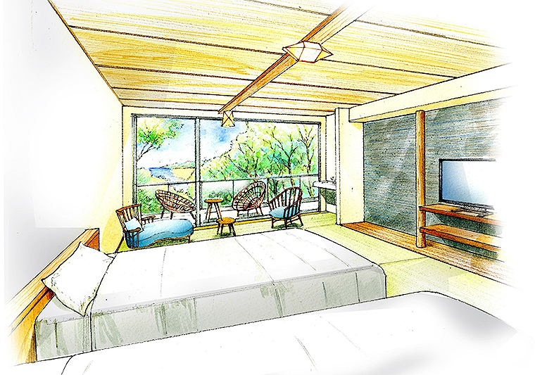 一面に広がる大きな窓やバルコニーから、大島の海と自然を快適に感じられるよう、「座りやすさ」にこだわった上質な家具を配置。寝具には、日本橋西川の掛布団、ベッドマットレスは「日本ベッド製シルキーポケットマットレス」を使用し、快適な眠りを追求。潮騒に耳を傾けながら、のんびりとした時間を過ごしてみて。