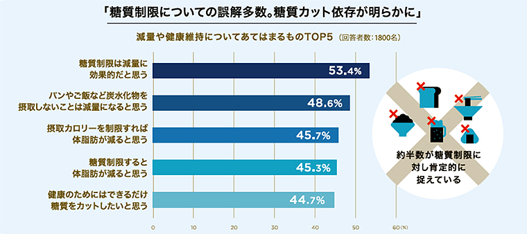 また、「健康のためにはできるだけ糖質をカットしたいと思う」と答えた人は44.7%もいて、多くの人が「糖質は悪」と否定的にとらえている実態が明らかに。