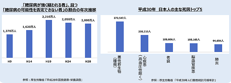 「代表的な例として挙げられるのが、いまや国民病とも呼ばれる糖尿病。平成28年度の「国民健康・栄養調査」によると、糖尿病有病者、予備軍ともにそれぞれ1000万人を超えました」