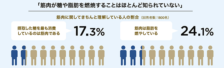 そのいっぽうで、筋肉は最も大量に糖や脂肪を燃やす「臓器」といわれ、1日にとる糖分のうち、70%以上を筋肉で消費されているといった事実や働きについては、対象的に低い理解度であることも明らかに。