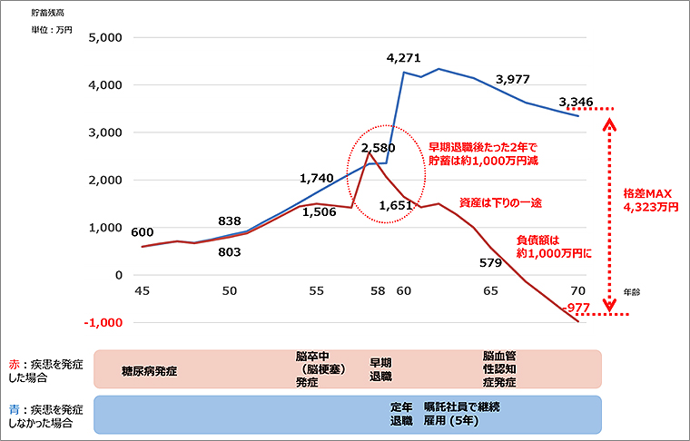 「たとえば、45歳で糖尿病を発症し治療を続け、55歳で脳卒中(脳梗塞)を発症したという男性Aさんの場合、以前と同様に働くことが難しく年収2割減少と試算。体調不良により58歳で早期退職し、退職金で一時的に残高は上がります」