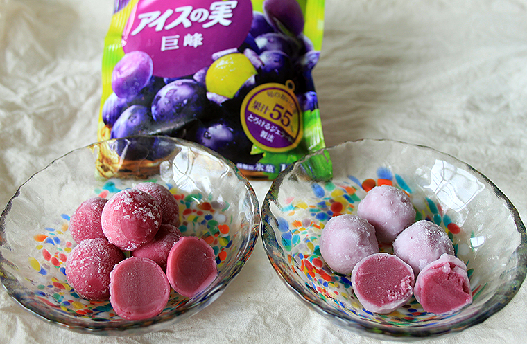 そして2020年夏限定版「アイスの実 巨峰」。これはもう、まず見た目で濃厚なぶどう色。見るからに果汁たっぷり感がわかる、あざやかな巨峰の色。