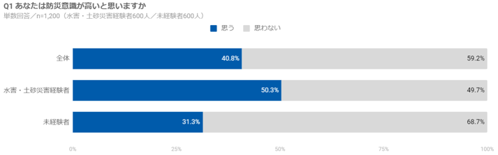 ――― 防災・減災事業、インフラ・メンテナンス事業などを手がける応用地質(東京都千代田区)は、全国の20歳以上の男女1200名(水害経験者600名+未経験者600名)を対象に「水害・土砂災害経験者と未経験者へ避難に関する比較調査」を実施。