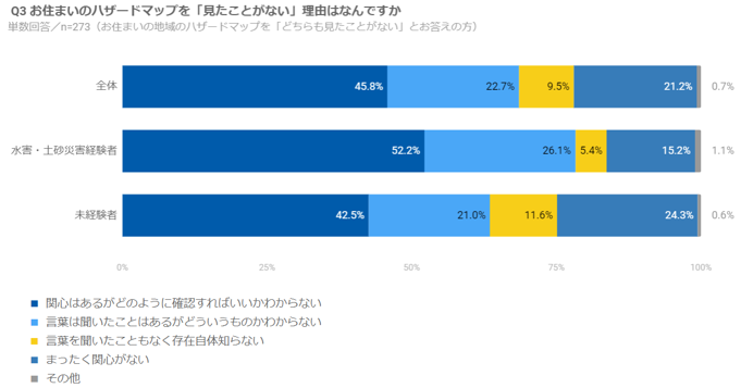 ハザードマップを「見たことがない」理由については、「興味はあるが確認方法がわからない」が最も多く半数を占めた
