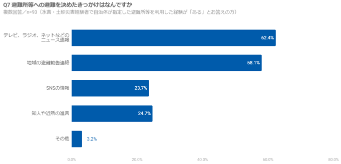 避難所などへの避難を決めたきっかけは「ニュース速報」と「地域の避難勧告連絡」が主流だった。