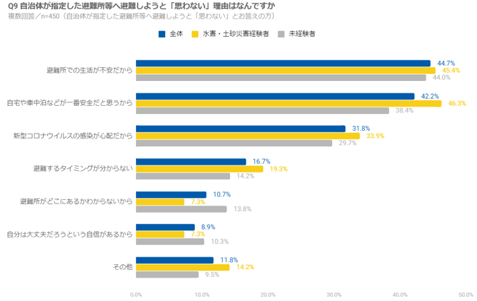 いっぽうで、避難所へ避難しない理由の1位が「避難所での生活が不安だから」という心理もみえてきた。