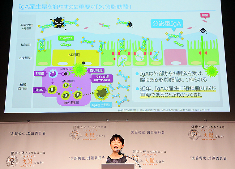 東京大学 定量生命科学研究所 免疫・感染制御研究分野 新藏礼子教授による基調講演「免疫力の強化に欠かせない強い“IgA”を作るためには?」では、体内で最も多く産生される抗体で、さまざまな異物に対応する IgA に着目した情報を分かりやすく教えてくれた。