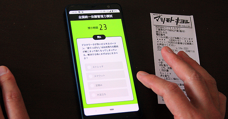 スマホのカメラでレシートを撮影し送信すると、体調管理力模試にトライ。スマホに出題が表示される5問を、制限時間内で答えた結果……。