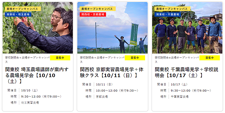 また、10月はオープンキャンパスを複数回・各地で実施。同大学校の埼玉実習農場や千葉実習農場、横浜実習農場、京都農場などで農場見学・体験入学・学校説明会を実施するから、気になる人は AIC 公式ホームページ(https://agri-innovation.jp/)をチェックしてみて。