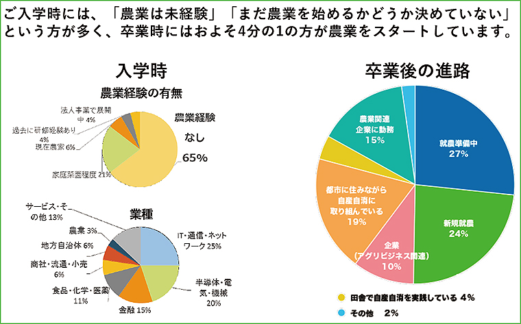 卒業生は、独立就農(新規参入)をはじめ、独立就農(Uターン移住)、地域おこし(Iターン移住)、雇用就農(農業界へ転職)、アグリビジネス起業、社内起業・キャリアアップなど、さまざまなステージへと踏み出している。