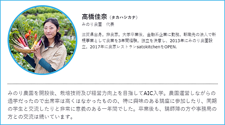農業を始めるために必要な「技術力・経営力・仲間」が得られる“学びと出会いの場”としていま注目を集め、外資系金融企業や大手広告会社、大手通信・IT企業などに務める30代や40代が、このAICを経て農業で成功を収めているケースが増えているという。