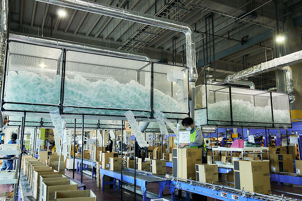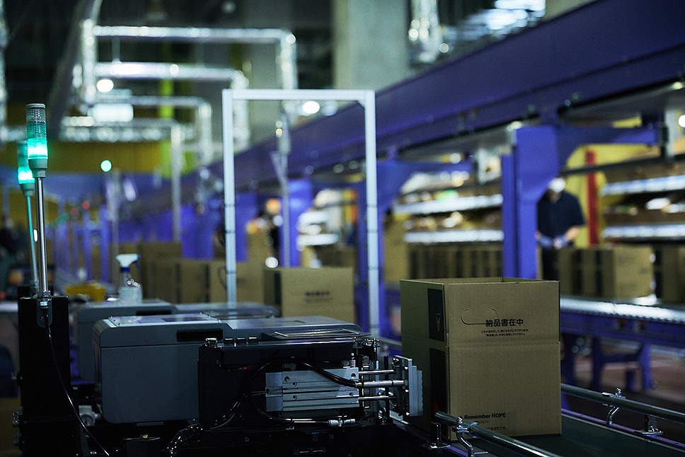 スタッフは、最新デジタルピッキング(注文商品の選別)で流れてきたピッキング用ダンボール箱(カートン)に番号と担当カラーの灯りを照合しながら、箱に詰めていく。