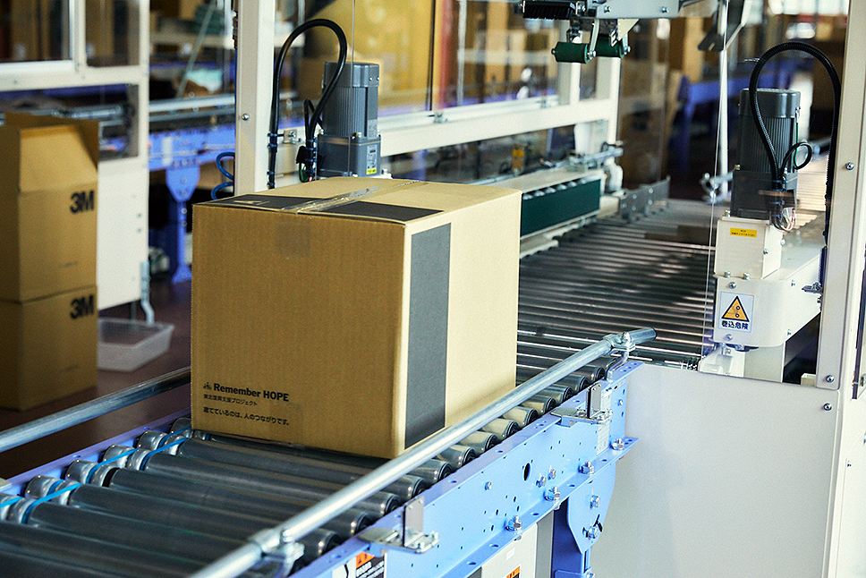 こうしたデジタルピッキングに加え、納品書などもデジタル化したことで、ペーパレス化も実現。商品を配送用の箱に詰めるラインで、配送用段ボール箱はカートン・フォーマーを通り、最適なサイズにオートで組み立てられる。