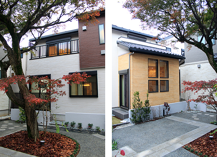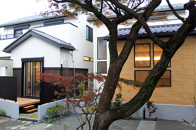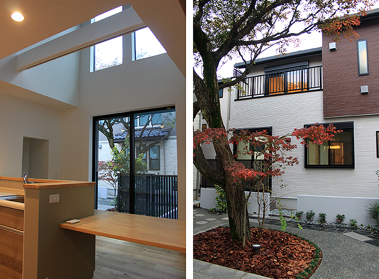 借景とは、庭園外の山や樹木などの風景を、庭を形成する背景として取り入れたもの。造園技法のひとつ。そう、この分譲住宅の中心には、1本のモミジの木が、この土地の歴史を物語るオアシスとして存在している。