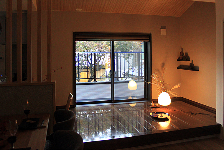 8号棟の2階リビング窓際には、光沢のあるフローリング「床槭樹」を採用し、床にモミジが映り込むという仕掛けも。また、窓に切り取られたモミジの姿は、絵画のように美しい。