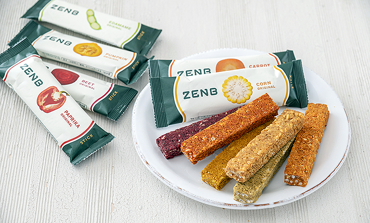 ZENB STICK(ミツカングループ)は、普段は食べずに捨てている皮や芯、種、さやまでまるごとの野菜と、玄米、キヌア、アーモンドや果汁を加えた野菜入りスティック。