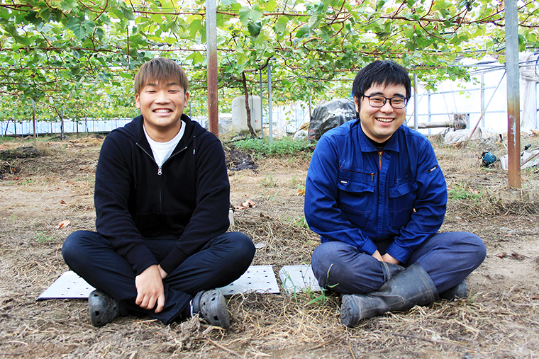 まずは二人の経歴から。小平亮介さんは、大阪の農業高校を卒業し、水稲を営む叔父の姿と島根の豊かな自然に惹かれ、島根県立農林大学校 農業科果樹専攻(2年)に入学。卒業後は、出雲市内のぶどう畑をひとりで管理し、初のぶどう出荷に向けて着々と整備を進めている。