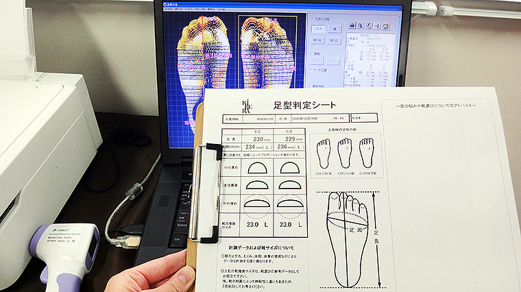 わずかな時間で両足の3Dサイズがデータ化・見える化され、これらの実測データをもとに最適な靴をオーダーしていく。