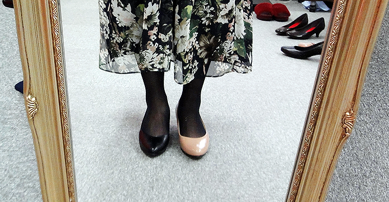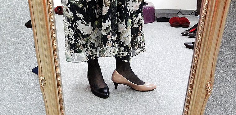 足へのフィット感がすごいから、写真のミドルヒールから、最終的には思い切って高めのハイヒールを選択。無理なく自然に歩けて、足も長くキレイに見えるから。