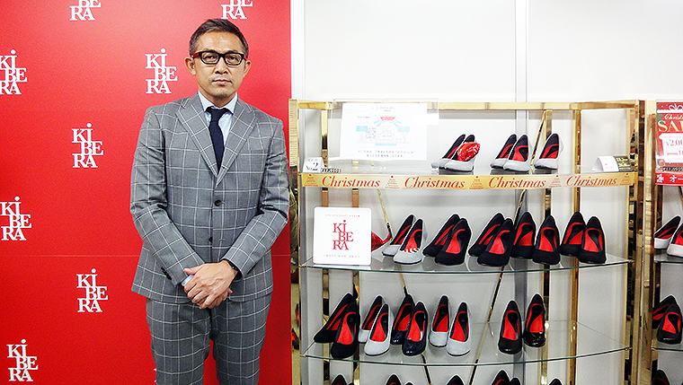 「キビラオリジナルで特許取得の“ビーナスヒール“は、ヒールとソールが一体成型のため、一般の靴と比べてブレが少なく安定していて歩きやすく、坂道も走れます」と話すのは、キビラ 玉井摂人マーケティング部部長。