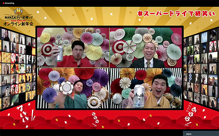 ZOOMに集まった1000人の参加者たちとアサヒスーパードライで乾杯し、4人ともこの新年会のために用意した新ネタを披露。キン冷えのスーパードライ生ビールと、爆笑ネタで温まったあとは、ぷは顔選手権へ。