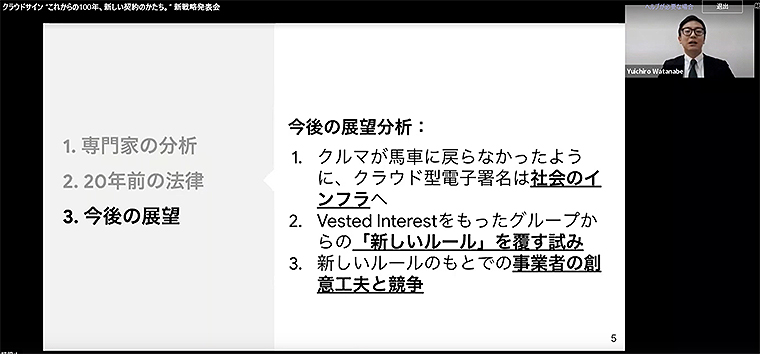 1月21日の事業戦略説明会には、弁護士ドットコム 内田 陽介 代表取締役社長、同 橘大地 クラウドサイン事業本部長、斎藤泰行 同副本部長、渡部友一郎 弁護士らが登壇。