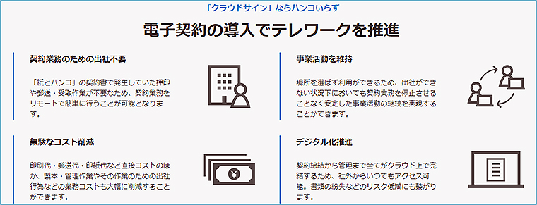 リモートワークの環境下においても契約書の証拠力を担保しながら、事業活動に重要となる円滑な契約業務が実現する。