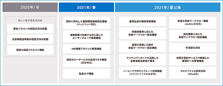2015年のサービス提供以来、導入社数10万社を突破し業界No.1に躍り出たクラウドサインは、こうしたトレンドにいち早く対応する一手として、2021年機能開発ロードマップを策定し、タグラインを刷新し、公開した。