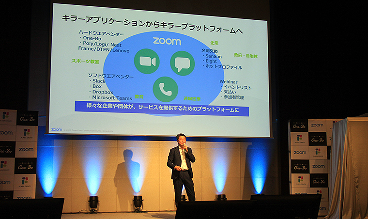 1月26日の「One-Bo」(ワンボ)発表会には、プラザクリエイト 大島康広 代表取締役をはじめ、同社 新谷隼人 取締役、ZVC Japan(Zoom)佐賀文宣カントリーゼネラルマネージャーらが登壇。