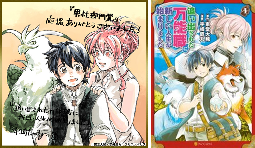 作品への思い・秘話:(原作 東堂大稀)この度は名誉ある賞に選んでいただき、ありがとうございます。これも『追い出された万能職に新しい人生が始まりました』を応援していただいている皆様、宇崎先生、らむ屋先生、編集の方々のおかげだと思います。この機会に新しく万能職のロアとグリおじさん達の物語に触れる方もたくさんいらっしゃるでしょうから、この栄誉に恥じないよう、今後も皆さんに楽しんでいただける作品をお届けできるように頑張ります。(作画 宇崎鷹丸)読んでくださった皆さま、投票してくださった皆さま、東堂・らむ屋両先生、本当にありがとうございます。万能職の世界ではふつうは「従魔師」や「錬金術師」といった肩書・約束事でまとめられがちな「職業」を巡って、半人前の主人公ロアをはじめ登場人物一人一人がそれぞれ一所懸命に行動しています。読者の皆さま御自身の就活や社会人生活と重ねて、彼らのがんばりを応援していただけるよう、これからも全力で描いてゆきます。