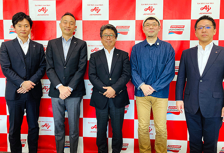 味の素冷凍食品 2021年春季 新製品・リニューアル品発表会 に登壇した味の素冷凍食品 黒崎正吉 代表取締役社長、下保寛 取締役専務執行役員、大竹賢治 製品戦略部長、熊田主道 販売マーケティング部長、シュウマイ潤ジャーナリスト。