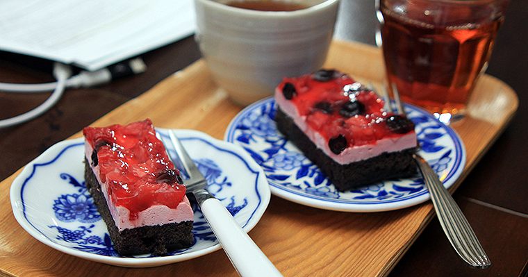 ――― そしておまけに、味の素冷凍食品の業務用 ハーフサイズ フリーカットケーキもチェック。いちごとブルーベリーの果肉を敷きつめた「ダブルベリー」は、果肉の酸味と甘さ、チョコレートケーキのほろ苦い味が、マッチ! これもいい!