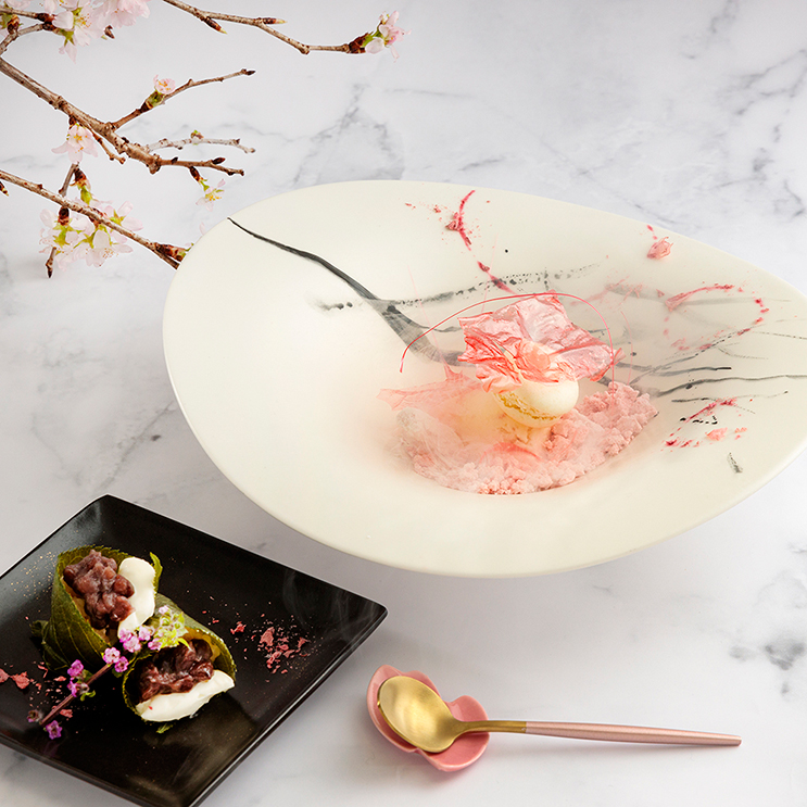 桜の花びらを混ぜ込んだジェラートにマシュマロや白餡のマカロンを添えて。仕上げには、パティシエがアイスパウダーで桜の花びらを咲かせて。道明寺の桜もちといっしょに。