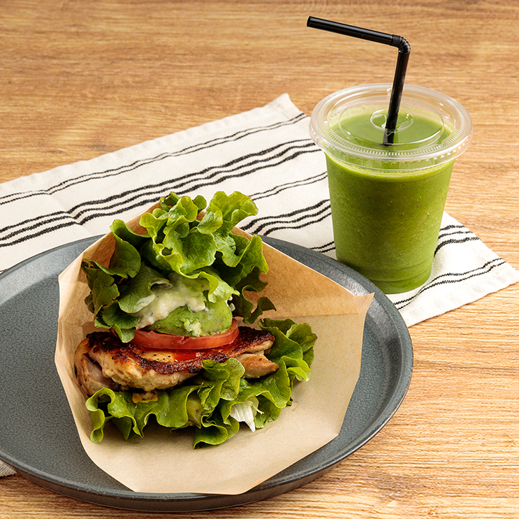 グリルチキン、「森のバター」といわれるアボカドを新鮮なグリーンカールで包んだ品。ヘルシーなのに食べ応えのある一品はわさび入りのタルタルソースがアクセント。