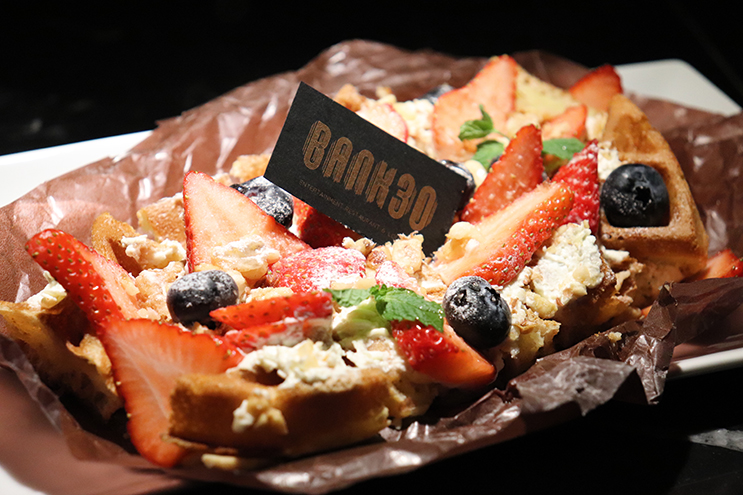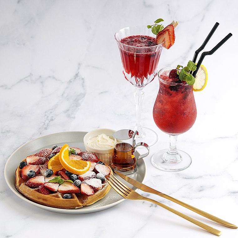 ワッフルの生地が隠れて見えなくなるまで苺とブルーベリーをトッピングしたベリーワッフル。ホイップとシロップにディップすれば口いっぱいに甘酸っぱい幸せな香りが広がる。
