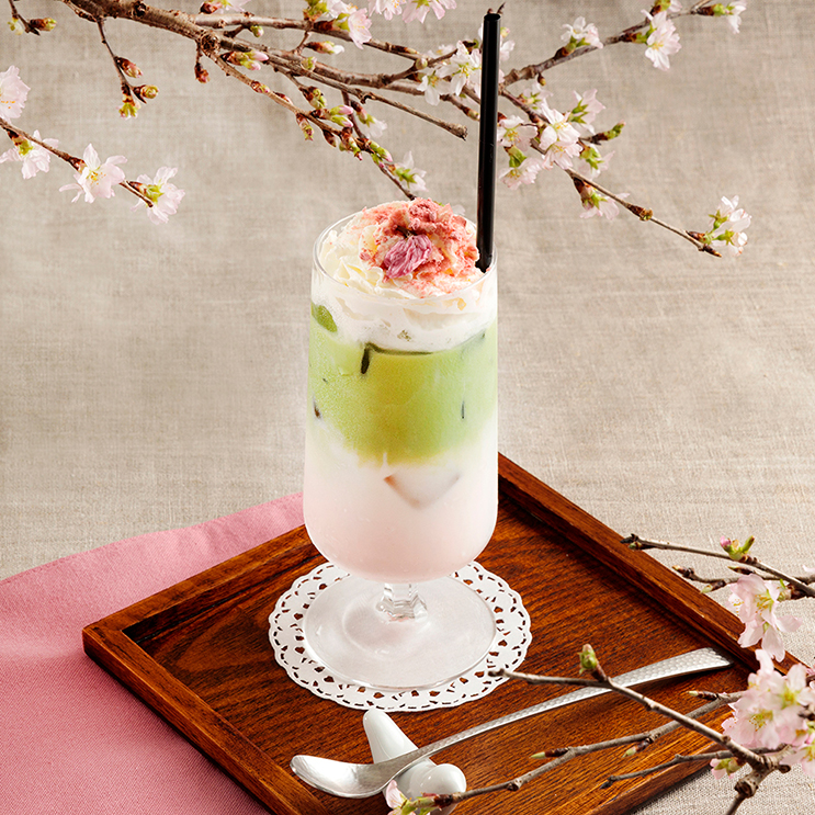 袋布向春園の抹茶ラテに桜風味のミルクをあわせた品。ホイップクリームにトッピングされた桜の花びらで春を感じられる一杯。