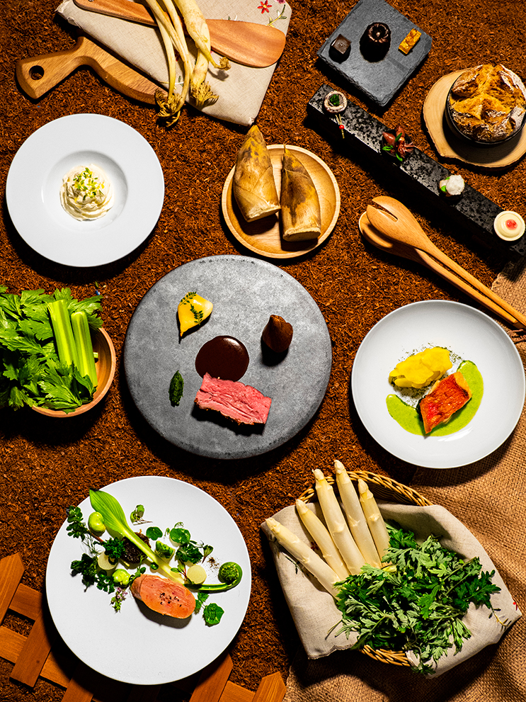 2021春のディナープログラム。春に旬を迎える美味しい春野菜「筍」「アスパラガス」「独活」「ヨモギ」などの食材を存分に使用し、食材の「花言葉」をイメージした演出で彩られた料理を届ける。