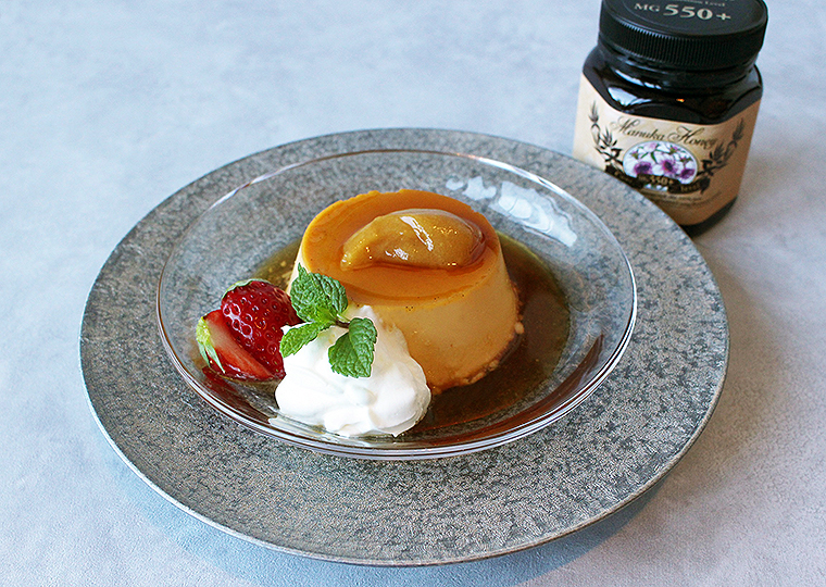 「いま人気のクラシックプリンにマヌカハニーをのせております。プリンの濃厚な甘さをマヌカハニーのふくよかな甘みが更に味を引き立てます。エスプレッソコーヒーとともにお召し上がり下さい」(山下春幸シェフ)