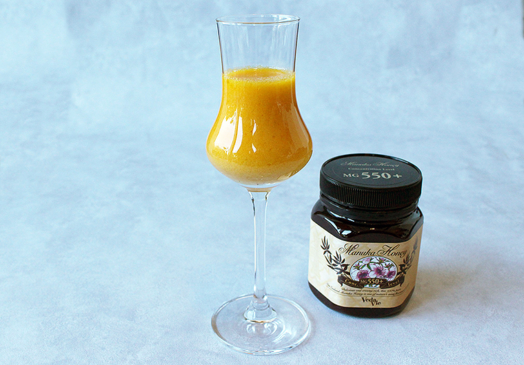 作り方は、(1)マヌカハニー以外の食材をミキサーに入れ混ぜる。(2)(1)にマヌカハニーを加え泡立て器などでよく混ぜる。