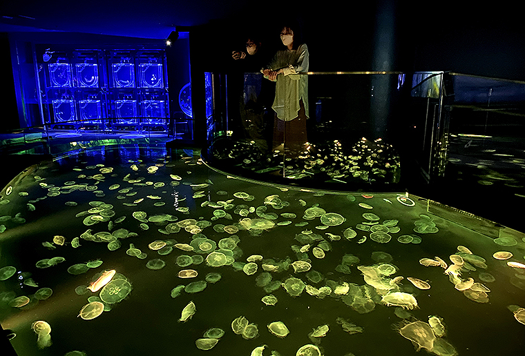 このビッグシャーレは、一般的なアクリル板で囲われた水槽と異なり、視界を遮らずにクラゲを見下ろす感覚が斬新。
