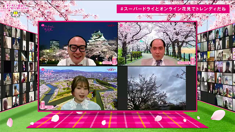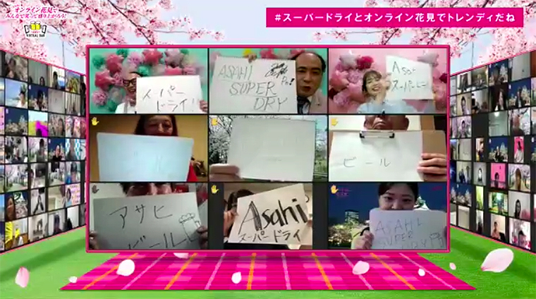 参加した1000人は、アサヒスーパードライを片手に、ぷち大喜利に参加したり、桜の花の画像・動画をみたり、乾杯したり……と「普段は絶対に体験できないお花見ビール」を体感した。