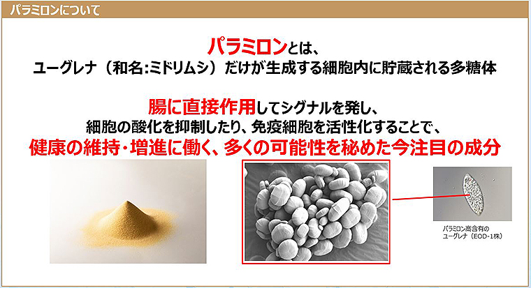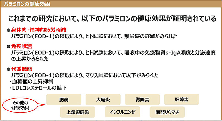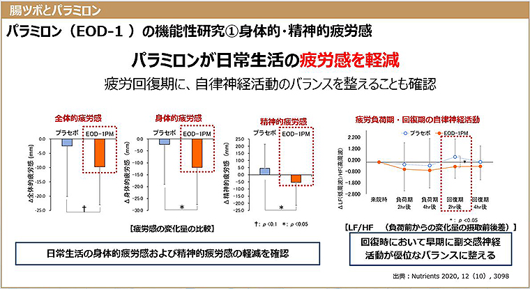 また、腸のケアの方法のひとつとして、パラミロン(EOD-1)の摂取による身体的・精神的疲労感の軽減などの試験結果についても解説。