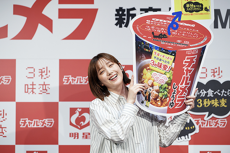 本田翼が「二度うま!」と叫んでるのは、タテ型カップめん「明星チャルメラカップ」シリーズの新コンセプトリニューアル版「味変パック」つきを試してるときの表情。