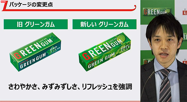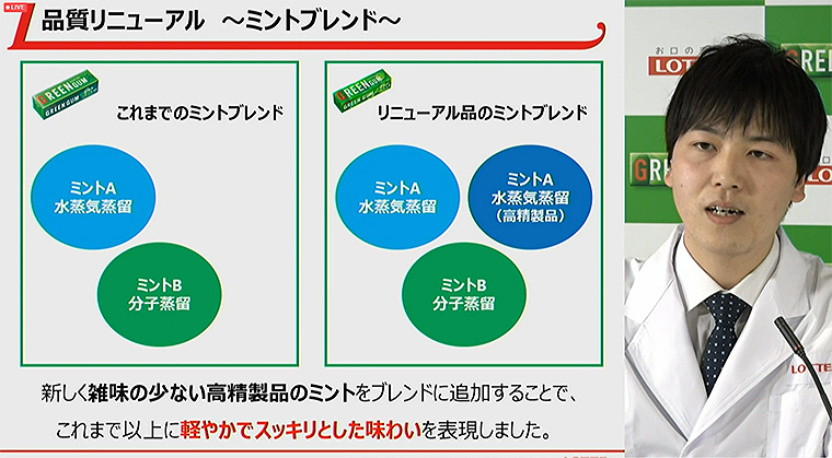 4月9日のロッテグリーンガム&クールミント説明会では、ロッテ マーケティング本部 ブランド戦略部 毛利彰太氏、ロッテ中央研究所チューインガム研究部 海老原京太氏が登壇。その進化ポイントをこう説明していた。