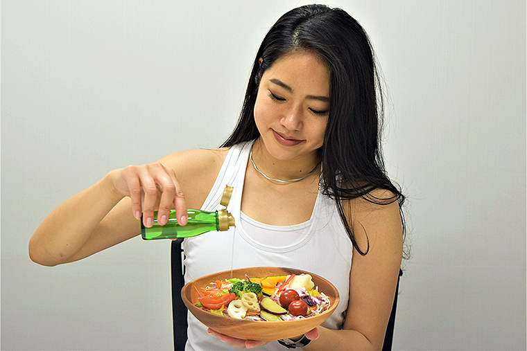 「無味無臭でどんな食事にも合わせやすく、サラダやお味噌汁のほか『毎日続けられるMCTレシピ』など、日々の食事で使っています。無理なく続け、MCTとともにライフスタイルを変えていきましょう。食事は、良質な脂質を選ぶことが大切です」(沖知子プロ)