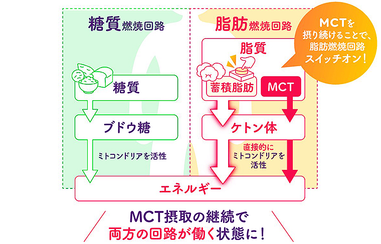 「通常、糖質をエネルギー源とする「糖燃焼回路」が優先的に使われるが、MCTを摂取することで体内にケトン体が生成され、脂肪燃焼回路を動かしてくれる。2つの回路が同時に働くことで、効率よくエネルギーを燃やし、脂肪が燃焼しやすい体質になる」