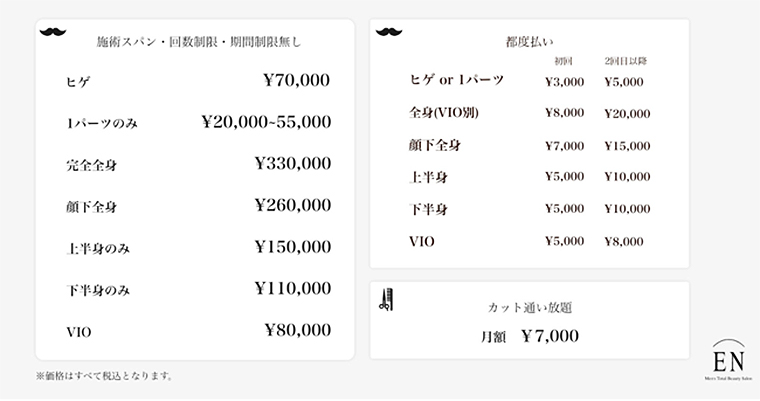 今回オープンした「EN men’s total beauty salon」では、一度の支払いで、それ以降の支払いはなく、完了まで追加金などを気にせず「わかりやすい脱毛」を体感できる。