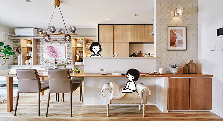 『ルピアコート津田沼』の32戸に採用しているピアキッチンは、住戸の中心部にダイニングテーブル一体型のキッチンが設置され、リビングにも洋室にも目が届くから、幼児期の子どもがいても安心。
