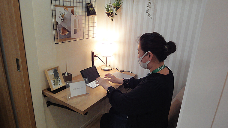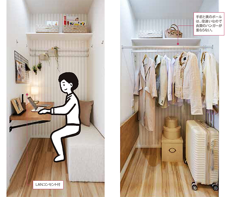 この『変身クローク』は、通常、収納として使えるクロークには折り畳み式のカウンターテー ブルが設置され、椅子を持ち込めば、程よい“こもり感”がある在宅スペースに変身させてくれる。